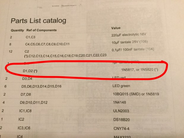 I ordered 1N5820 diodes, it turns out that the lead diameter is too large for the through hole on the board. I built the power supply section and when I got to installing the diodes, I found out about the lead diameter, so I ordered 1N5817 diodes.